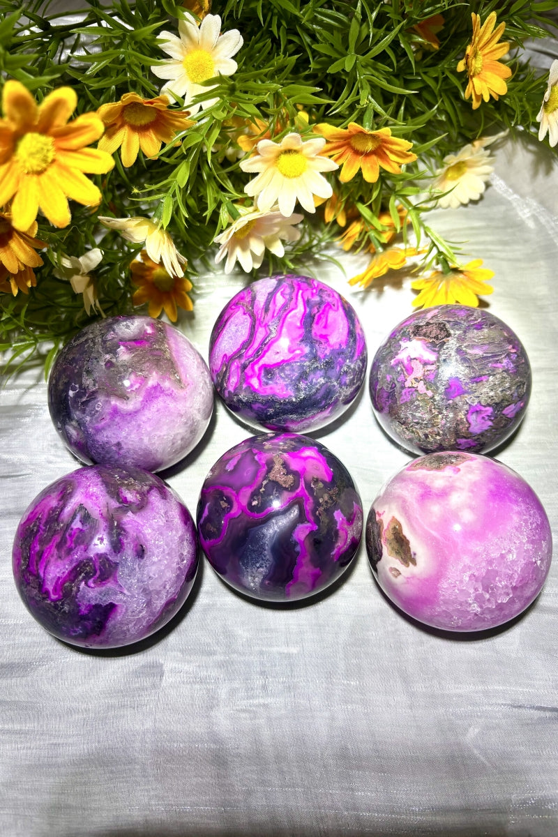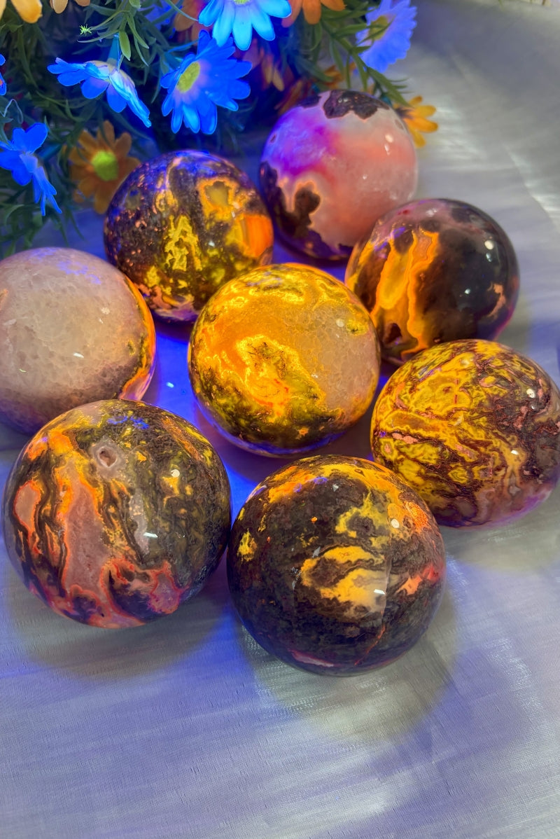 Pink Moss Agate Spheres with Strong UV Flash 2.36"